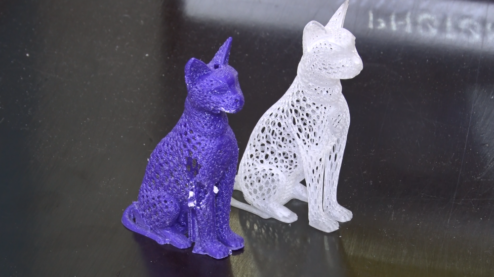 Новинку осваивают уже месяц. Обычные геометрические фигуры слишком простые для нее, поэтому в качестве тестовых заданий выбирают модели посложнее. Вот наглядный пример - белая модель кошки выполнена на новом оборудовании. Как видите, новинке по плечу самые сложные фигуры.