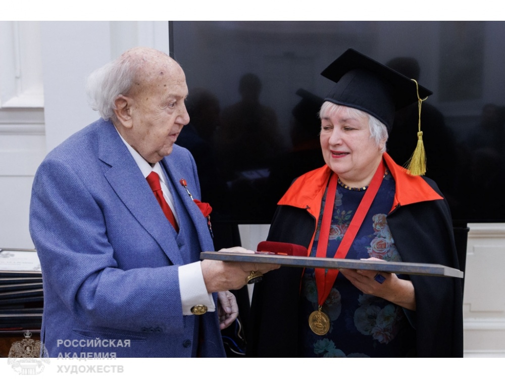 «В Академии художеств, на Пречистенке, в Москве. Есть такой зал - Белый зал он называется, где проходят заседания Президиума Академии художеств и в этом зале - меня и еще одного московского художника приняли в Почетные члены. И медаль, и этот академический наряд вручил Зураб Константинович Церетели. Он лично приехал на встречу, на это заседание».