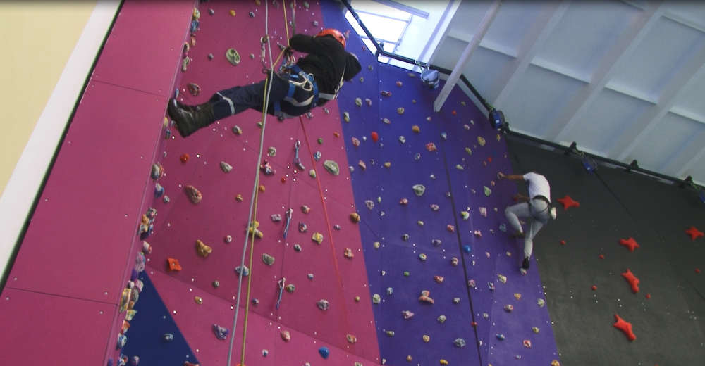 «Это не совсем даже скалодром, это многофункциональный тренажер с искусственным рельефом, на котором могут заниматься спасатели, просто туристы, скалолазы, ледолазы, спелеологи, ну и любители потренироваться, как я их называю – «Человеки-пауки». Очень хорошее покрытие, классные зацепы, оно противоскользящее, а еще оно противоожоговое. То есть если ребенок сорвется, он ручки и ножки себе не обожжет».