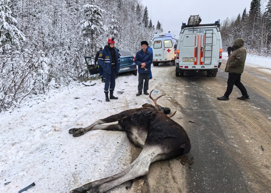 Водитель рассказал, что животное неожиданно выскочило на трассу из леса. Но перебежать ее лось не успел. Машина ударила его по ногам, отчего тот подлетел и рухнул на землю. От удара погиб на месте. Водителя из покореженного авто извлекли спасатели, с тяжелыми травмами доставили в больницу. В Госавтоинспекции утверждают, что он превысил скорость. А в центре защиты населения предостерегают автомобилистов: будьте готовы к тому, что в этих местах в лесах водятся лоси, в любой момент, в любое время суток они могут выскочить на дорогу. Компенсация за сбитого лося составляет 80 000 рублей. Ее берет Минприроды за вред, нанесенный природе.