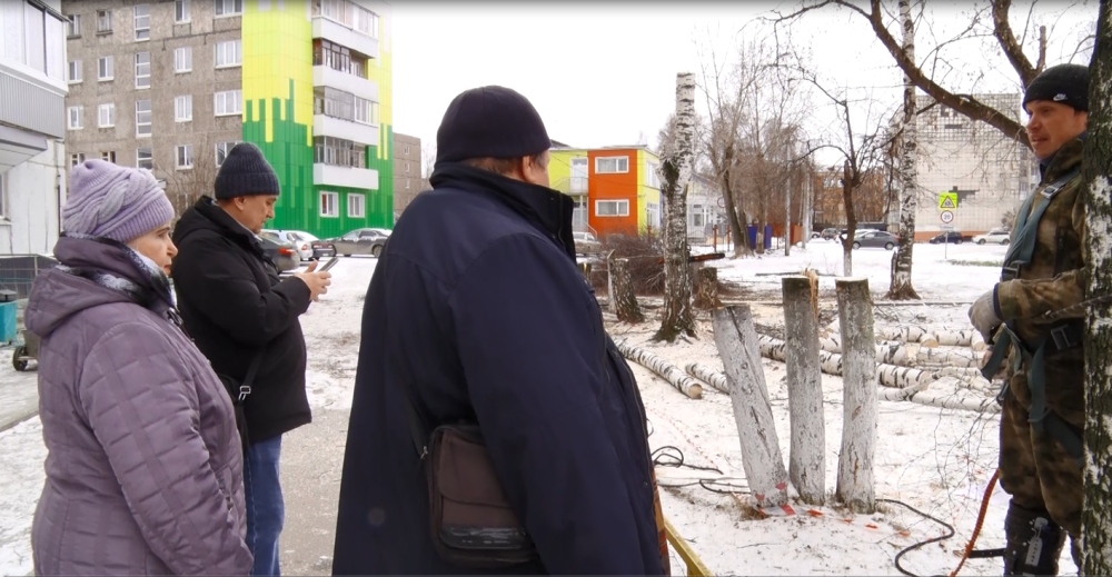 «Это подряд 60 с лишним деревьев спилили. Мы всё сажали. У нас так летом красиво здесь. Мы даже первое место по городу как-то занимали в семнадцатом или в тринадцатом году, в озеленении это. У нас и сирень, и черёмуха, и тут и рябина, и чего только… Вот всё попилили. Вот, смотрите, детская площадка, главное».