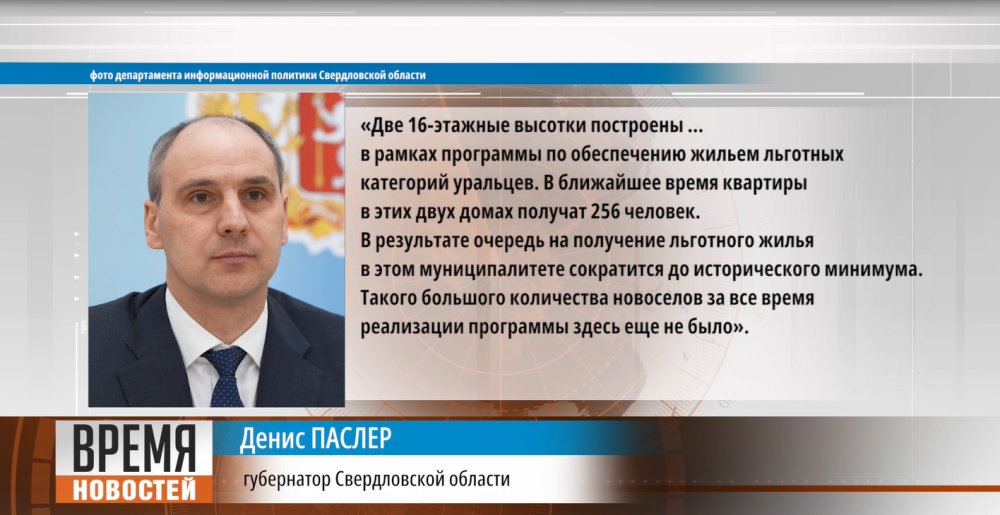 «Две 16-этажные высотки построены… в рамках программы по обеспечению жильем льготных категорий уральцев. В ближайшее время квартиры в этих двух домах получат 256 человек. В результате очередь на получение льготного жилья в этом муниципалитете сократится до исторического минимума. Такого большого количества новоселов за все время реализации программы здесь еще не было». Конец цитаты.