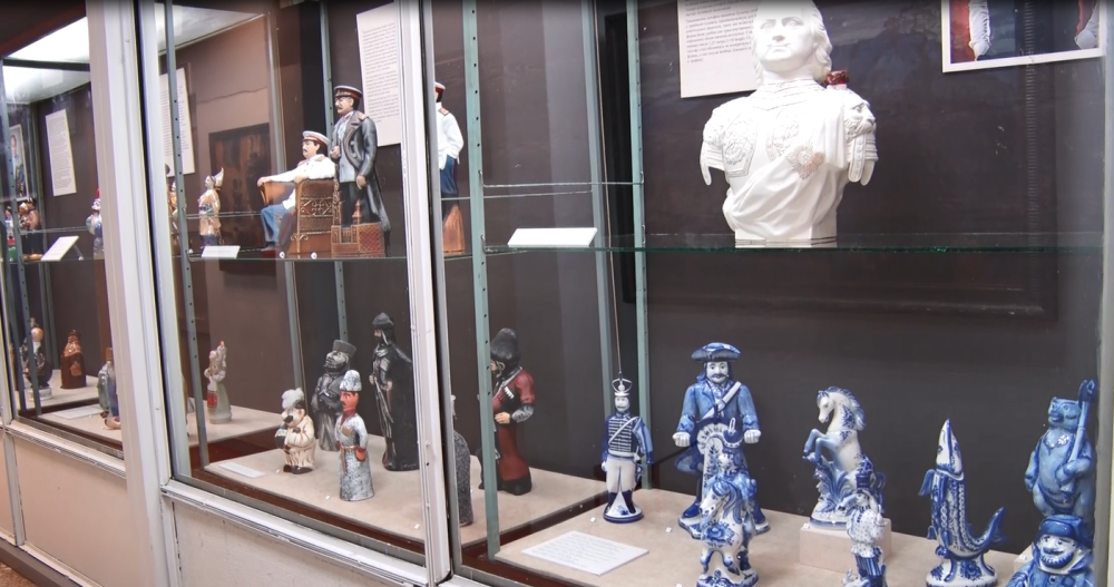 Штофы предназначены для хранения напитков. Этот, в виде бюста Петра Первого, будто отлит из гипса. На самом деле он керамический, из неглазурованного фарфора. Раньше он хранился в частной коллекции, а с осени прошлого года стал музейным экспонатом. На выставке «Дары музею. Предметы и коллекции» Петр Великий встречает гостей в первой же витрине.