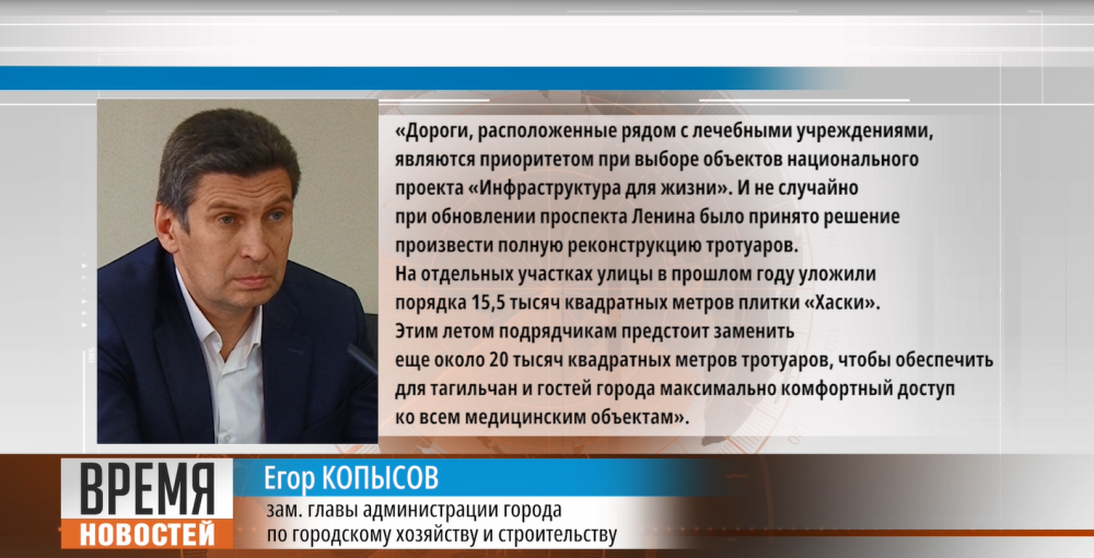 На комплексное обновление по нацпроекту «Инфраструктура для жизни» из федерального и регионального бюджетов выделено почти 346 миллионов рублей. Из них 143 миллиона рублей подрядчик «Тагилдорстрой» освоил еще прошлым летом. Поменял практически три километра гранитных бордюров и заасфальтировал свыше 40 тыс. квадратных метров проезжей части, приступил к реконструкции тротуаров. В этом году дорожникам предстоит переложить трамвайные пути на некоторых участках проспекта и заменить еще около 20 тысяч квадратных метров тротуаров, ведущих к медучреждениям. На проспекте Ленина расположены филиал микрохирургии глаза, центр медицинских осмотров, стоматологическая поликлиника. Также рядом несколько зданий Демидовской горбольницы, перинатальный центр и медколледж. Все работы на центральной артерии города планируют завершить до октября.