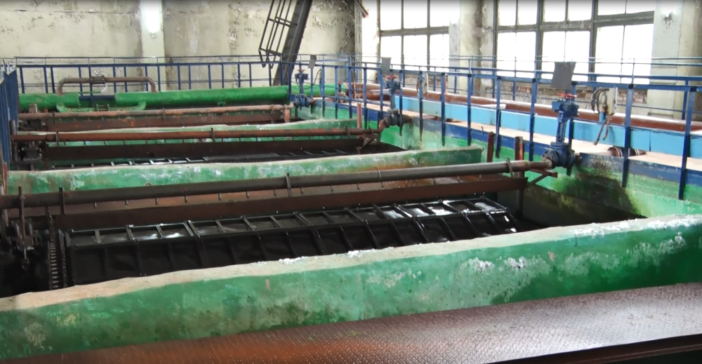 «Мы находимся сейчас на крыше этих отстойников. Всего пять отстойников по две секции. Итого 10 секций. Мы произвели полную очистку от ила в данных отстойниках. Это можно сделать только через крышу. У каждого отсека получается колодец. Спускались, вымывали, и весь осадок вывозили там через сбросники и насосами».
