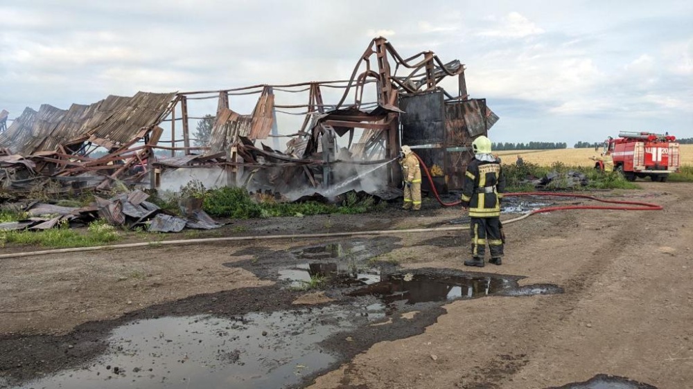 Пострадал урожай прошлого года - кормовое зерно и жмых. Жмыха, по официальной информации, было 10 тонн. Ранним утром на складе никого не было. Пожарную службу вызвали, когда одноэтажное металлическое здание уже охватил огонь. В тушении было задействовано 9 человек личного состава дежурных караулов, 4 автоцистерны. Сейчас проверку ведут дознаватели МЧС. Предварительно причина – короткое замыкание электропроводки. Сумма ущерба устанавливается.