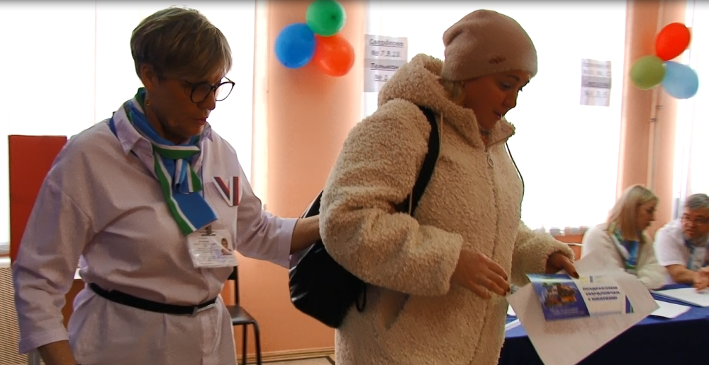 «Вы можете проголосовать через трафарет. Мы вас ширмочкой закроем, и вы можете проголосовать. Тут четыре клеточки. Вы бюллетень складываете».