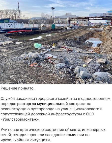 Решение принято - контракт расторгнут. Подрядчик не будет завершать ремонт улицы Октябрьской революции. Мэр Владислав Пинаев сообщил в своем Telegram-канале, что Служба заказчика городского хозяйства в одностороннем порядке разорвала контракт с компанией «Уралстроймонтаж» на реконструкцию моста на Циолковского и сопутствующей дорожной инфраструктуры.