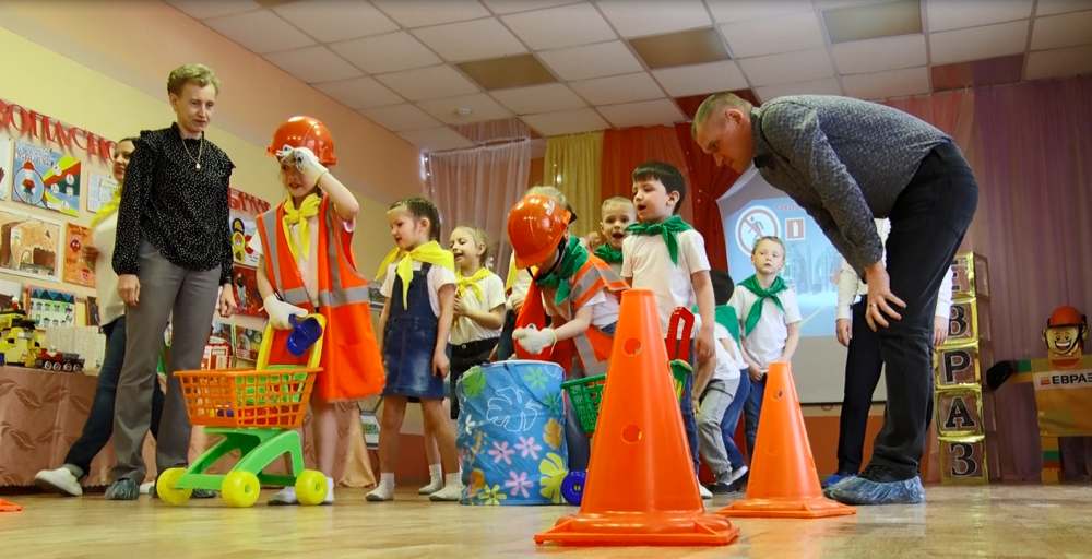 Воспитанники показали небольшой концерт, а взрослые в свою очередь, рассказали для чего нужна каска и специальная обувь на производстве, и как уберечь себя от рисков и травм в цехе. Скучных лекций не было, всё это дети узнали, играя и соревнуясь в шуточных эстафетах.