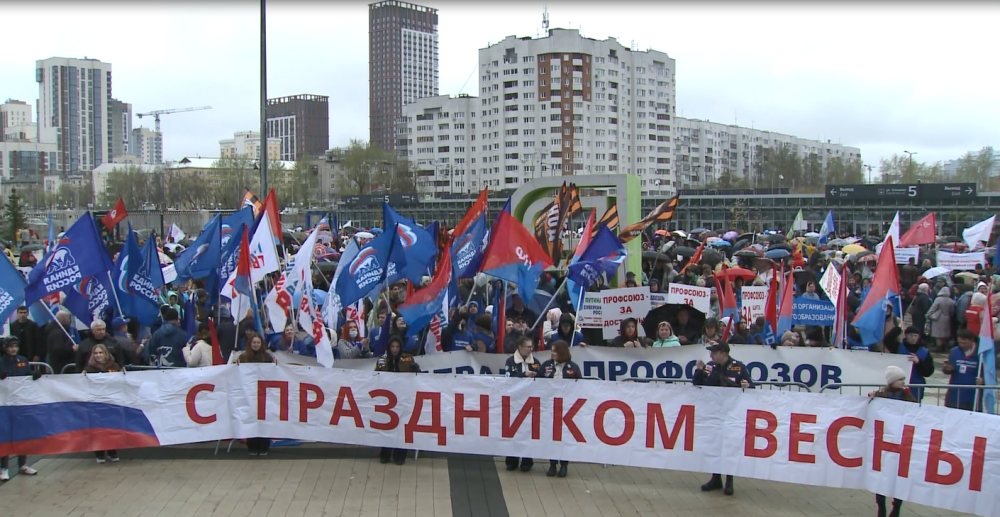 «По традиции на митинг собираются представители самых разных профессий, работники промышленных предприятий, учителя, врачи, волонтёры, молодёжь. Словом, все те, кто создаёт добрую славу нашему региону и устойчивое развитие нашего региона. В этом году мы отмечаем 90-летний юбилей Свердловской области. На Среднем Урале создано порядка 30 новых производств и более 2,5 тыс. рабочих мест. Строятся больницы, школы, детские сады, новые промышленные предприятия. И это всё благодаря упорному труду наших земляков».