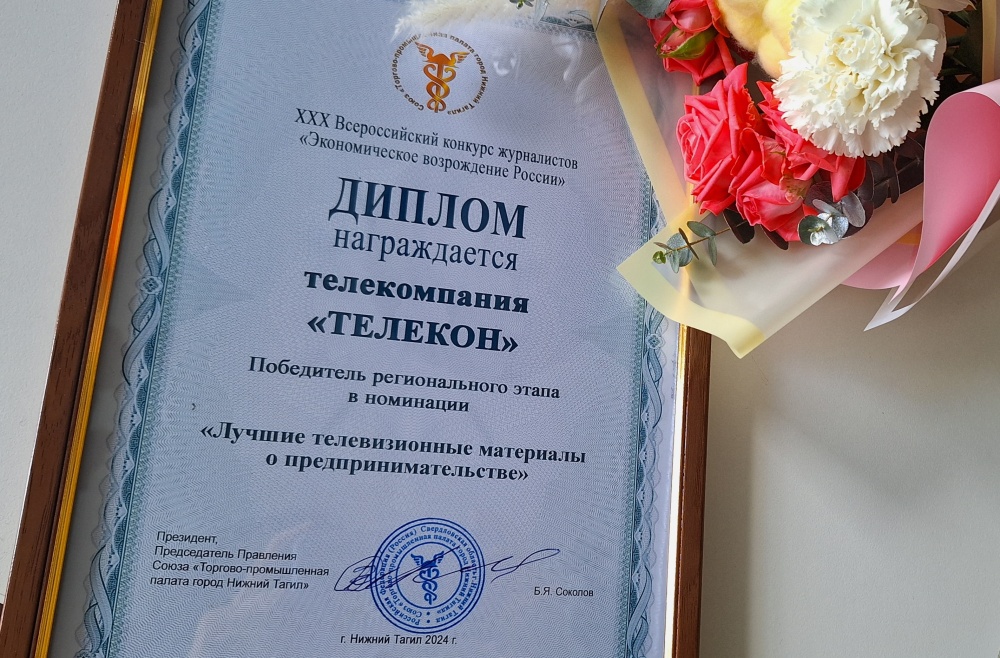 Президент Торгово-промышленной палаты Нижнего Тагила Борис Соколов вручил «Телекону» диплом «Лучшие телевизионные работы о предпринимательстве» в региональном этапе журналистского конкурса «Экономическое возрождение России-2023».