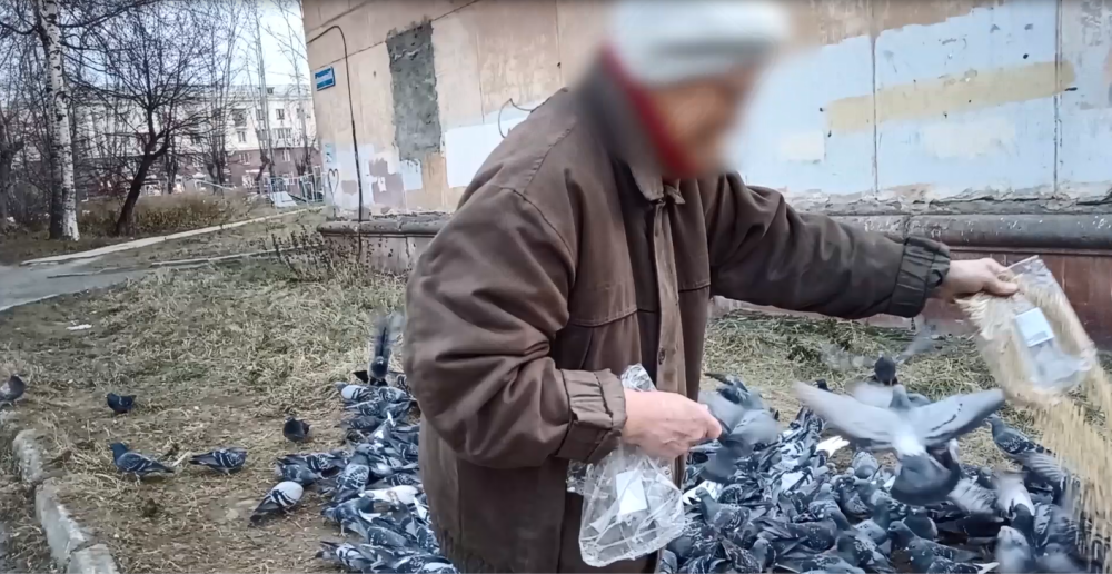 «А эти голуби, она вот… Вот сейчас, вот смотрите, никого нет. Вот стоит ей только выйти, все голуби будут здесь, возле нее. Они уже прекрасно знают, во сколько она выходит кормить, во сколько, что она делает. Вот это все время так, и все лето это. И садятся они на окна, садятся на балкон, окна пакостят. Летом так я вообще не успеваю их отмывать. Только вымою-вымою, через неделю посмотрю, они опять все…».