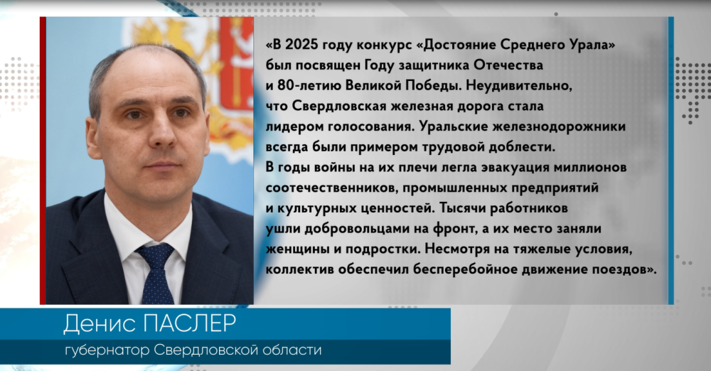 «В 25 году конкурс «Достояние Среднего Урала» был посвящен Году защитника Отечества и 80-летию Великой Победы. Неудивительно, что Свердловская железная дорога стала лидером голосования. Уральские железнодорожники всегда были примером трудовой доблести. В годы войны на их плечи легла эвакуация миллионов соотечественников, промышленных предприятий и культурных ценностей. Тысячи работников ушли добровольцами на фронт, а их место заняли женщины и подростки. Несмотря на тяжелые условия, коллектив обеспечил бесперебойное движение поездов», - прокомментировал итоги голосования губернатор Свердловской области Денис Паслер в своих соцсетях.