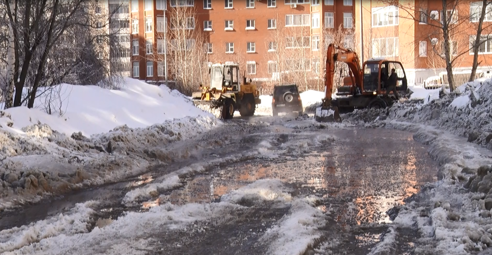 «Тагилдорстрой» убирает с проезжей части снежную кашу и лёд - пригнали сюда экскаватор и трактор. И это уже четвертый раз за месяц. Только вчера техника чистила дорогу, а сегодня во время объезда заметили, что здесь снова течет вода.