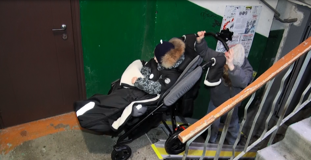 «Для самостоятельного спуска это опасно. А для спуска, как вот я Сашу спускаю... с помощью, получается. Очень удобно. Ну, тоже привыкать надо, приноравливаться, как лучше, как удобнее самим будет. То есть мы съезжали сначала передом, впереди коляска, так не очень, а задом – удобно».
