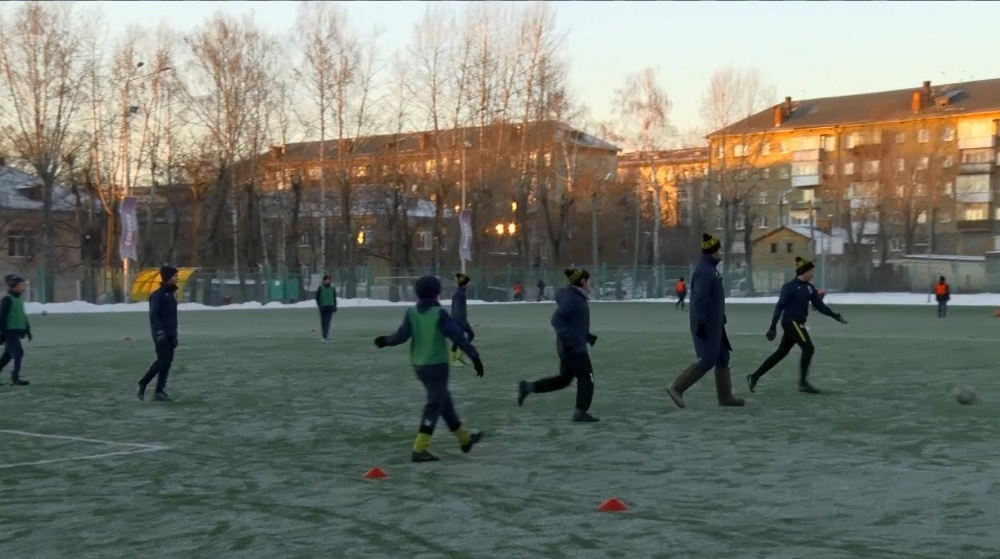 На поле и летом, и сейчас, зимой. В бутсах, по искусственному газону, но утеплившись, на стадионе у 64-ой школы бегают футболисты. Тренировки пока можно проводить только на свежем воздухе, и этому рады.