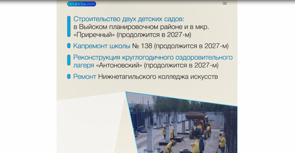 Что в Нижнем Тагиле? Вот информация о проектах, которые запланированы в нашем городе. - Продолжится строительство двух детских садов - на Вые и в Приречном микрорайоне, оно продолжится и в 2027 году, - Запланирован капитальный ремонт школы №138, продолжится и в 2027 году, - Начнется реконструкция загородного оздоровительного лагеря «Антоновский», ремонт продолжится и в 2027 году, - Запланирован ремонт Нижнетагильского колледжа искусств - Начнется долгожданный капитальный ремонт концертного зала в Нижнетагильской филармонии - Начнется также капитальный ремонт Центра образования №1 на Красном Камне - Продолжится строительство крытого катка на ул. Красноармейской - Спорткомплекса на ул. Фрунзе - Школы на 1200 мест на Гальянке в микрорайоне «Александровский» - Планируется строительство газовой блочно-модульной котельной в поселке санатория Руш - В планах завершение строительства станции водоподготовки «Южная» - Намечена разработка проектно- сметной документации на реконструкцию очистных сооружений в посёлке Уралец - На базе Нижнетагильского горно-металлургического колледжа им. Черепановых будут созданы Центр профессиональных компетенций, проект рассчитан и на 2027 год, а также кластер по программе «Профессионалитет» - В 2026 году начнется модернизация Нижнетагильского техникума металлообрабатывающих производств и сервиса. Модернизация продолжится и в 2027 году - В 2026 году в Нижнем Тагиле продолжится ремонт дорог, продолжится переселение горожан из ветхого и аварийного жилья. Запланировано также и обеспечение жильем нуждающихся в улучшении жилищных условий.