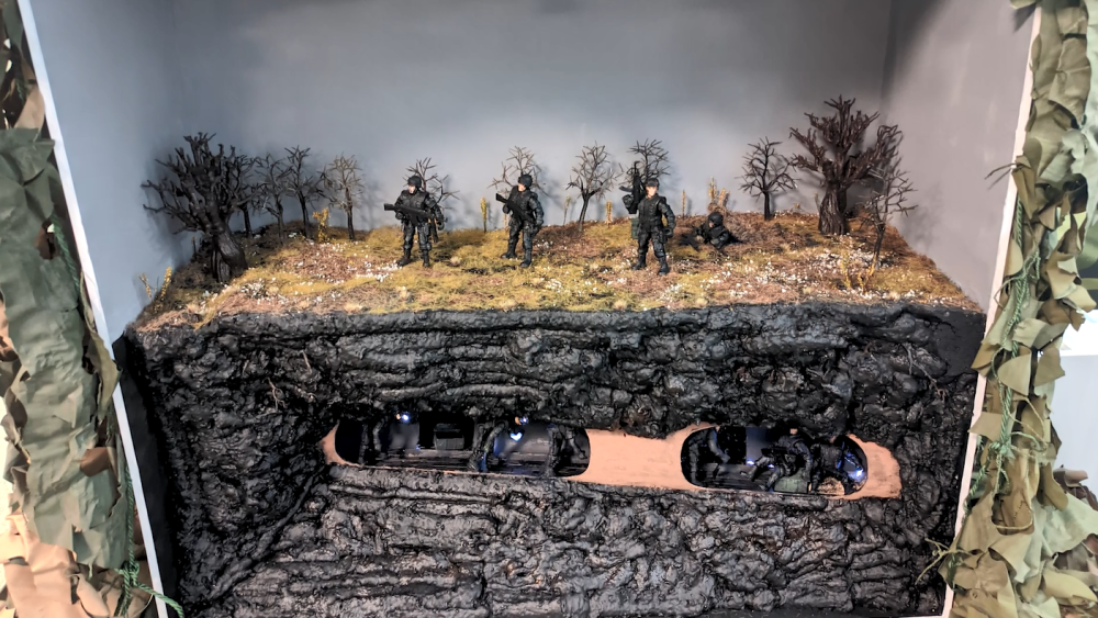 «На макете представлены бойцы. То, как они уже проходят по трубе, это мы можем видеть в левой части макета. Также в левой части макета мы можем увидеть специальные отсеки, которые используются бойцами для того, чтобы пополнить свои запасы и провиант. Также в правой части мы можем увидеть, как бойцы отдыхают перед тем, чтобы выйти на поверхность. И уже верхняя часть полностью отражает ландшафт, которое представляло себя место, куда выходили наши бойцы, и как, собственно, выглядит выход».